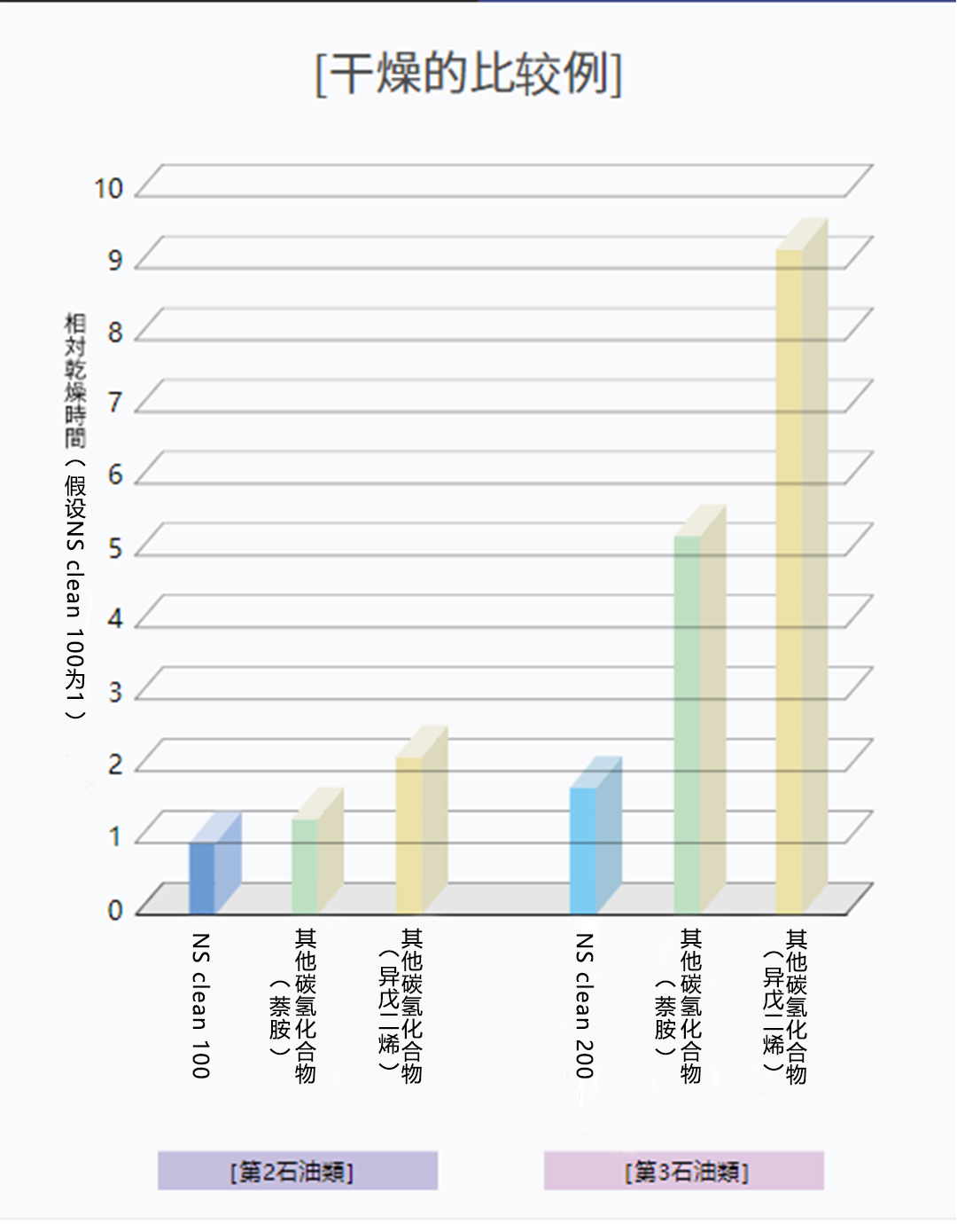 eneos清洗劑與各種清洗劑的清洗性比較; eneos清洗劑具有窄的沸點范圍,并且不包含難以干燥的重質組分,因此它具有優異的干燥性。eneos清洗劑是一種清洗劑具有高分離效率的清洗劑