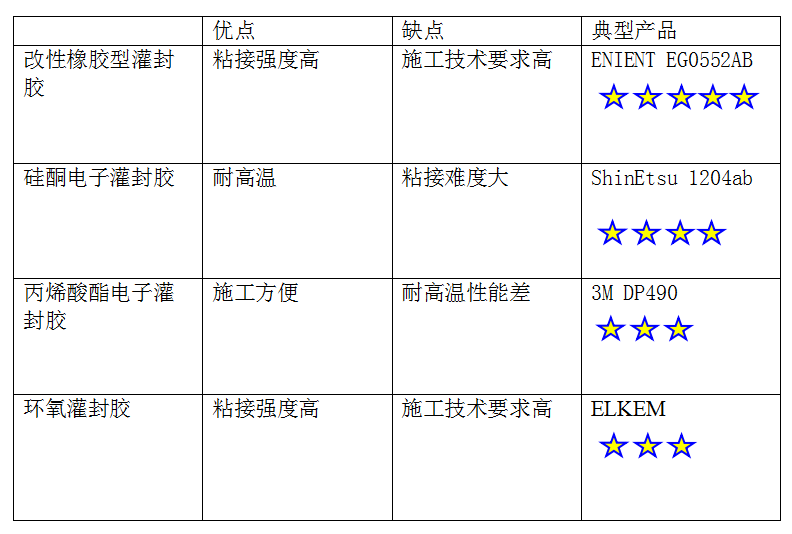 根據成分和性能的不同,電子灌封膠可以分為環氧樹脂灌封膠、硅酮灌封膠、聚氨酯灌封膠、環氧丙烯酸酯灌封膠等多種種類。其中,環氧樹脂灌封膠具有耐高溫、耐化學品腐蝕能力;硅酮灌封膠具有優異的耐高低溫性能和電絕緣性能;聚氨酯灌封膠具有優異的抗沖擊性和強度;環氧丙烯酸酯灌封膠具有良好的導熱性能和耐候性能等特點。