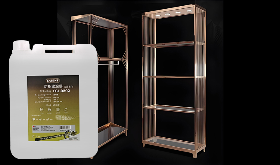 4.油性納米防指紋油:將油性技術和納米技術結合,從而得到一種操作方便又極透明細膩的涂層,并且擁有油性產品的絕佳附著力,同時降低了成本。以ENIENT EGL0202單液免烤型防指紋油為例,噴上自干即可達到比烘烤更強的性能,并且透明度高,做出來的不銹鋼制品十分高檔。