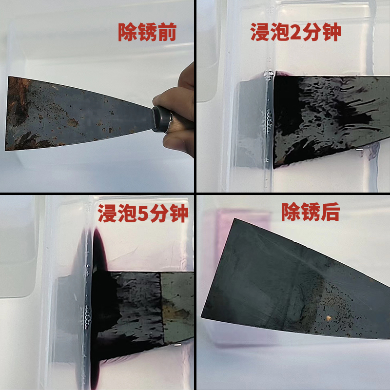 2. 需要浸泡有效,大約浸泡6小時左右能夠徹底的清除銹漬,但是除銹效率較高。同樣的除銹劑能夠清除更大量的銹蝕。除銹劑更換頻率較低,更高效率。這種中性除銹劑采用跟前一種同樣的原理,只是在配比上,有效成分更多,配方更為優(yōu)秀。
